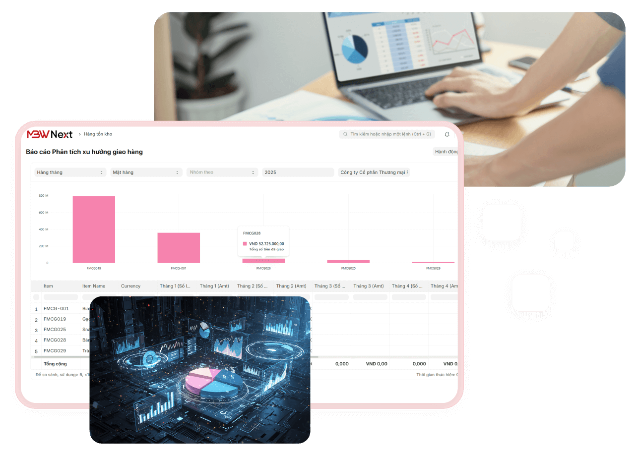 Theo dõi chính xác hiệu suất bán hàng, tồn kho, công nợ và lợi nhuận thực tế. Với dữ liệu luôn real-time, MBW Next cung cấp nhiều dự báo sớm và cảnh báo giúp CEO ra quyết định nhanh và nắm thế chủ động trong vận hành doanh nghiệp.