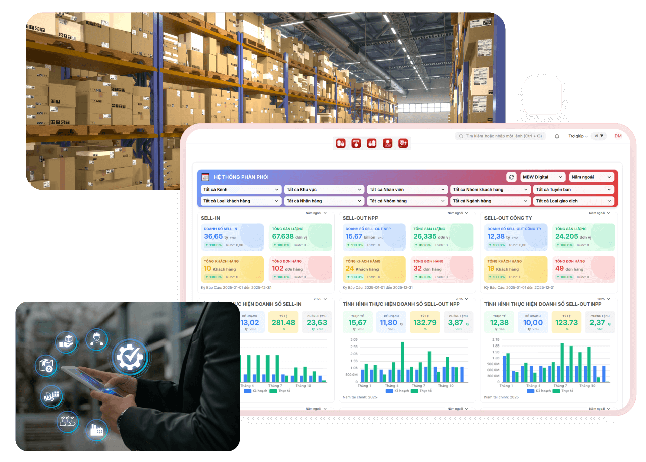 Đặc biệt, MBW Next kết nối chặt chẽ quản trị hệ thống vận hành (Mua – Bán – Kho – Tài chính – Sản xuất) với quản trị hệ thống phân phối (DMS) đa kênh – đa tầng, giúp doanh nghiệp vừa kiểm soát toàn diện hoạt động nội bộ, vừa quản lý hiệu quả kênh phân phối ngoài thị trường trên cùng một nền tảng thống nhất.