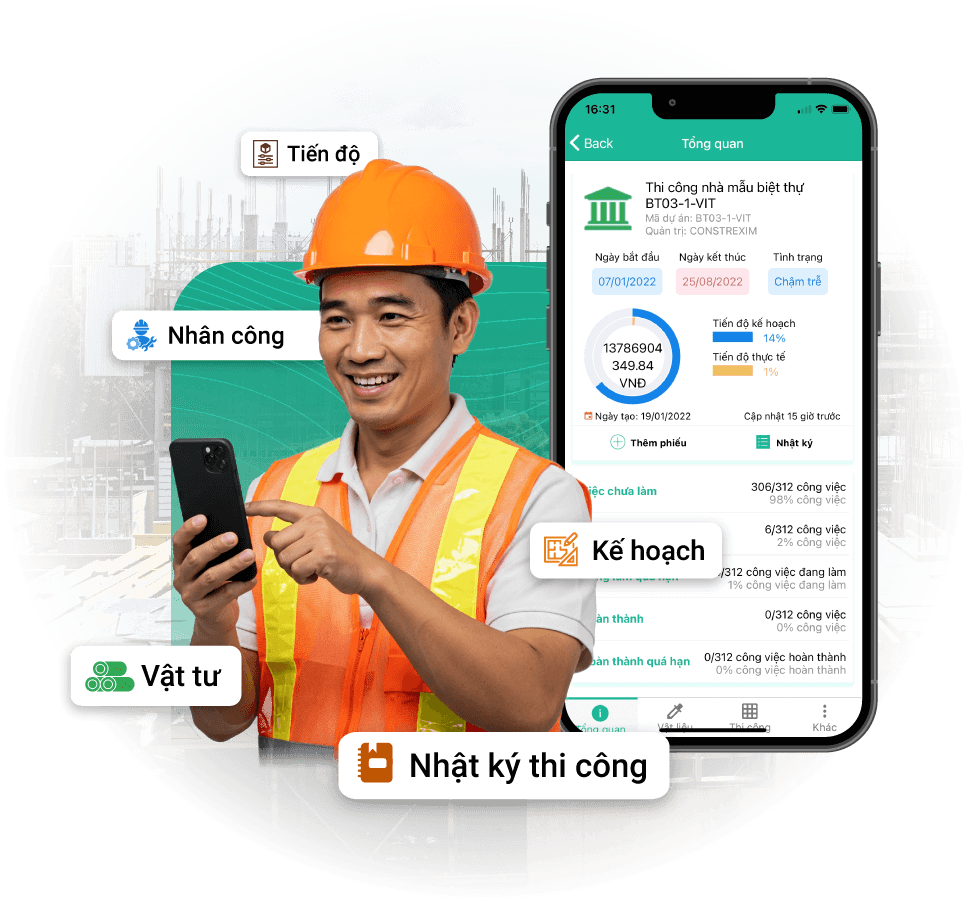 Đội kỹ sư, chỉ huy trưởng dễ dàng dùng app mobile để lập nhật ký thi công hàng ngày, khai báo tiến độ từng hạng mục & khối lượng thi công (vật tư, nhân công, vấn đề…) chi tiết.