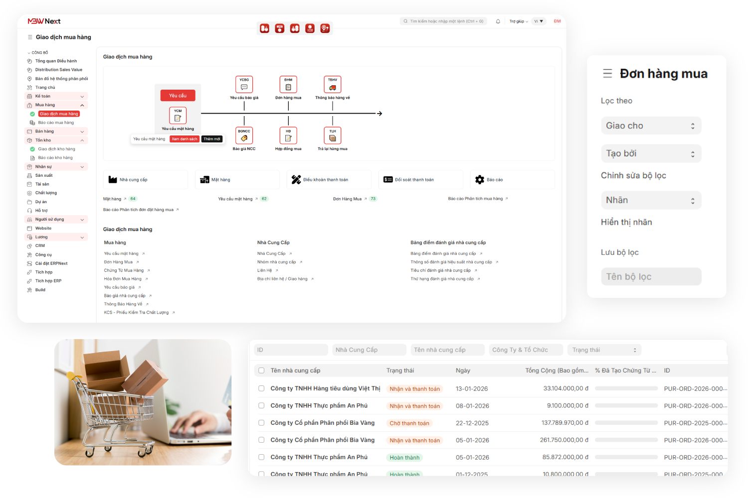 Cung cấp hệ thống báo cáo từ chứng từ đến phân tích tổng hợp. Hỗ trợ doanh nghiệp đánh giá hiệu quả mua hàng, theo dõi chi phí và hiệu suất nhà cung cấp.