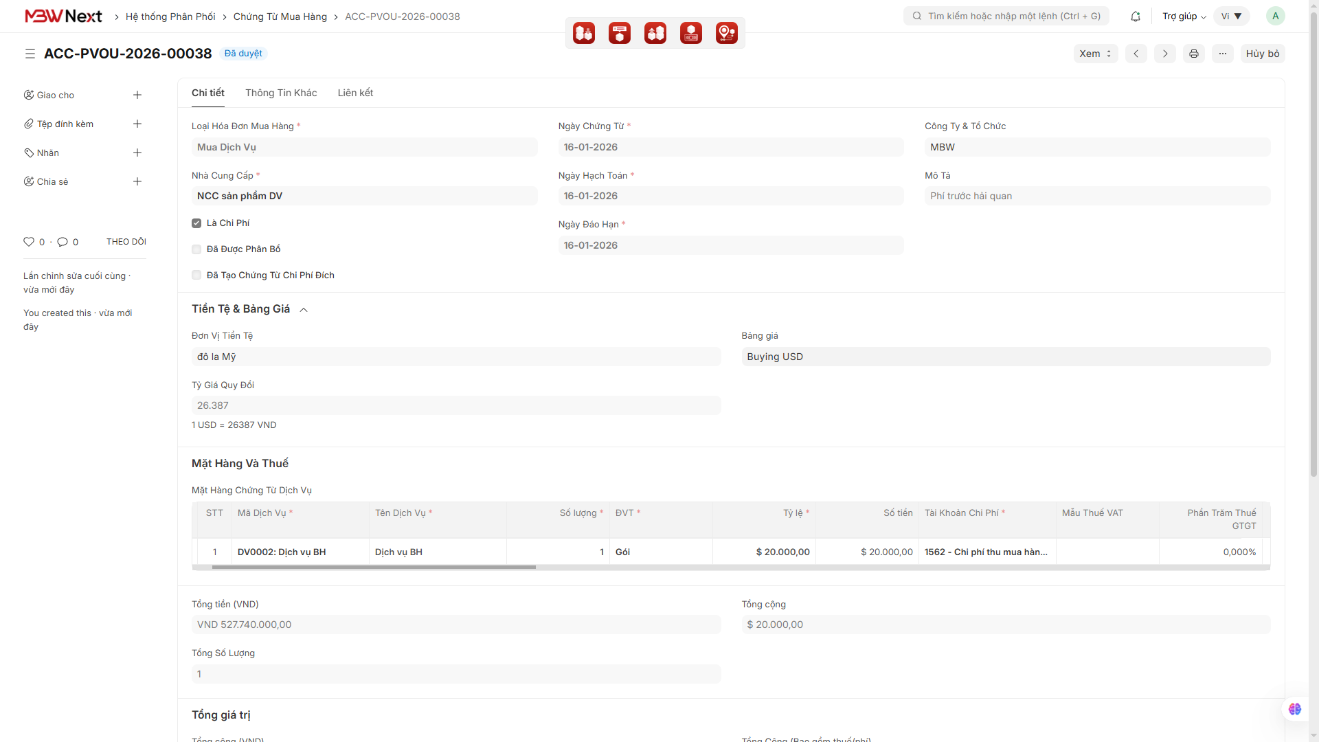 Trên đây là toàn bộ luồng thao tác xử lý bài toán mua hàng nhập khẩu nhập kho trên MBW Next. Thông qua Chứng từ Mua hàng (Purchase Voucher), doanh nghiệp có thể ghi nhận đầy đủ các cấu phần chi phí, quản lý nghĩa vụ thuế, liên kết chứng từ và phân bổ giá vốn một cách chính xác trong cùng một quy trình thống nhất.